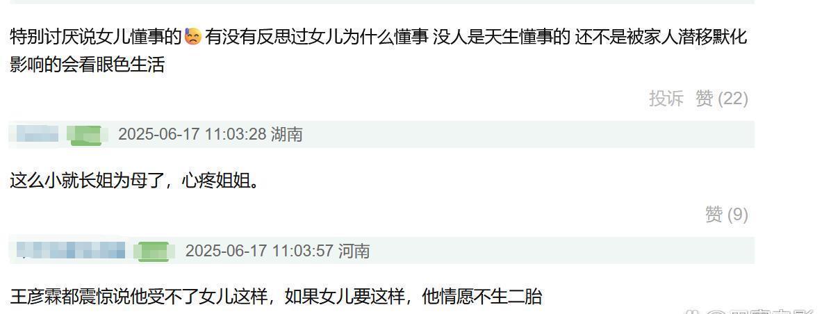 网友们则初始抵制:“有莫得反想过女儿为什么懂事?是天生懂事的如故被家东谈主潜移暗化的?”、“弟弟和父母是爽了,小女孩我方的叮属谁来管呢?”